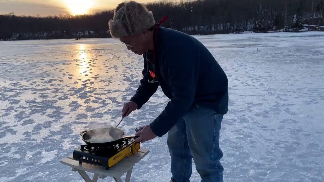 As the sun began to set, the afternoon shadows grew longer. The flags on the tip ups stayed in their set positions the entire time, as we had no bites that afternoon. Since the fish were not in a biting mood, I decided to break out the cast iron skillet to prepare our onion cheese steak meal. Hot food cooked on a ice-covered lake rivals the finest meal at a 5-star restaurant!