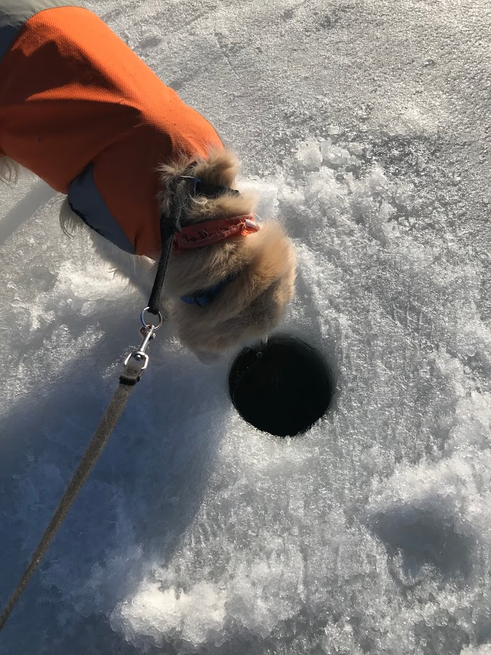 We waited with much anticipation for a tip up flag to trip off signaling a bite or the tug at the end of the line where our wax worm tipped jig dangled. Even the family dog, Mickee peered through the neatly cut holes in the ice looking, waiting and hoping for that bite.