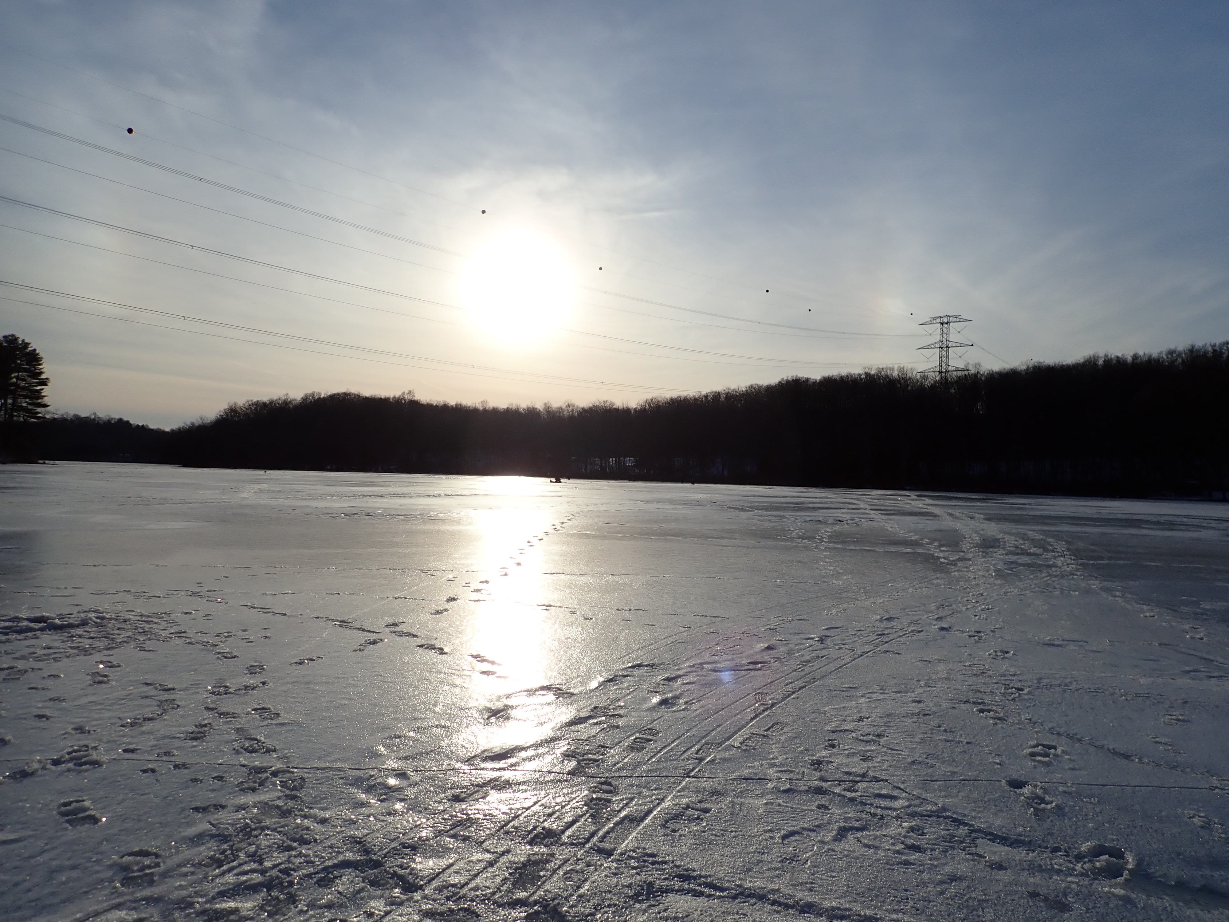 Cautiously setting foot on the frozen lake, I had great anticipation of an afternoon of ice fishing. The first holes were quickly drilled through the six-inch thick ice! The hand- powered Nils auger easily cut through the sun softened ice. Traditional wooden tip-ups and a few newer HT Polar brand tip ups were baited and set up with shiners and fathead minnows. The fresh live baits were purchased from Andover Hunt & Fish. This shop is well stocked and the service was very friendly. I also had an ice fishing rod with a tiny wax worm tipped on a jig that was held at ready to be lowered through the hole in the lake.